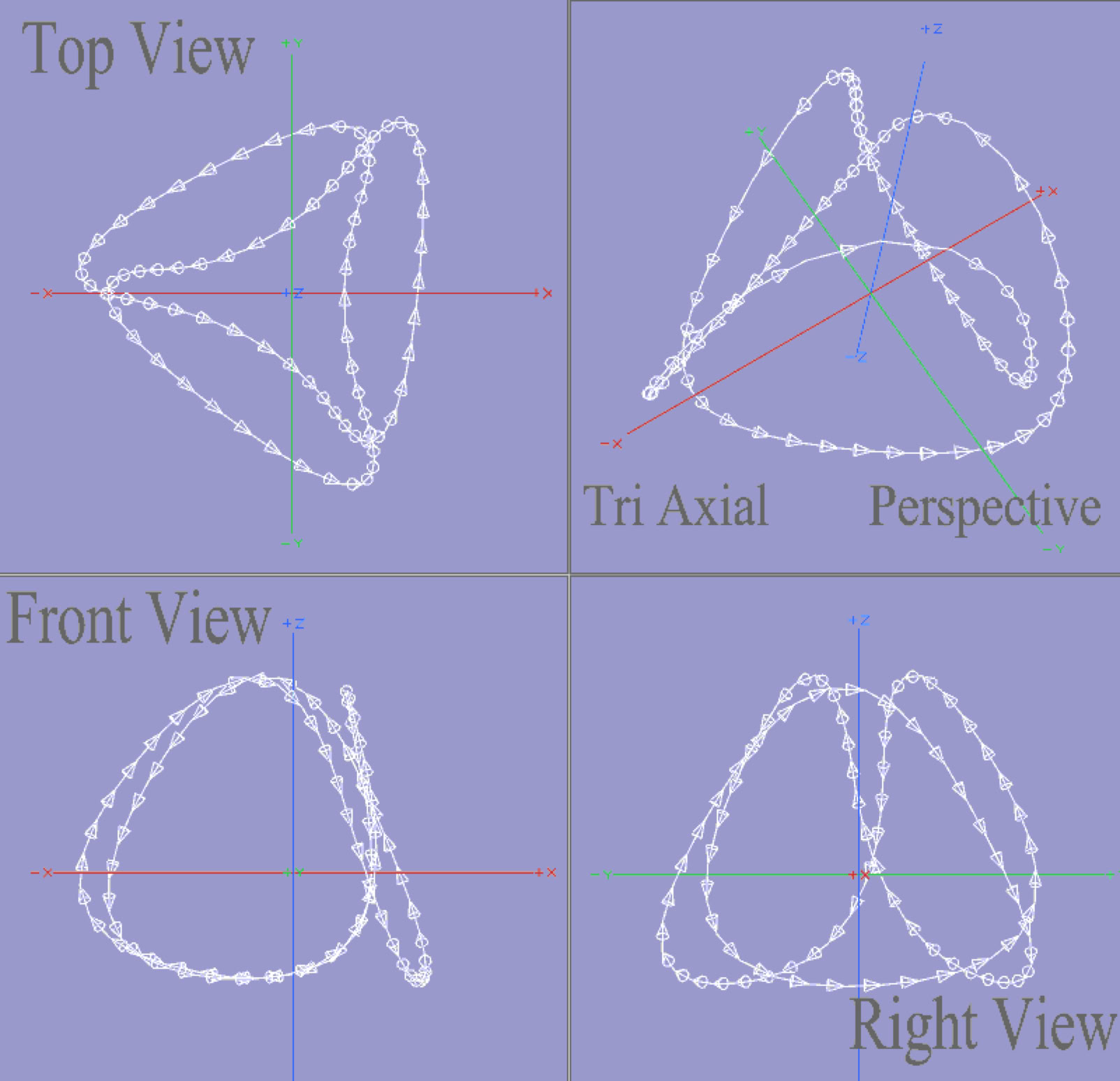 Below: A lower resolution of parameters are shown to convey the triaxial vortex. In the formZ geometry app, there is provided, a generic, helix tool set which enabled this discovery, with its spin directionality, governed by optional clockwise versus counter clockwise windings, (which are expected to generate positive or negative polarity); and in addition, the facetted helix form is optionally smoothed-out in various, optional axial directions, by a separate curve tool. .