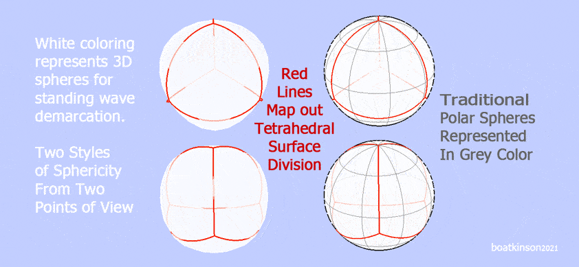 Geodesic sphericity is next used to contemplate the nature of Interspaces, starting with arguable arrangements of tightly packed spheres, followed by other arrangements of necessarily, more spacious Interspaces Geodesic spheres will here imprint the the interspace surfaces with its ambiguous polarities or many subdivisions. Only further below will bonding of spheres be briefly touched upon, as this webpage intends only to analyze the preliminary idea of standing wave particles.