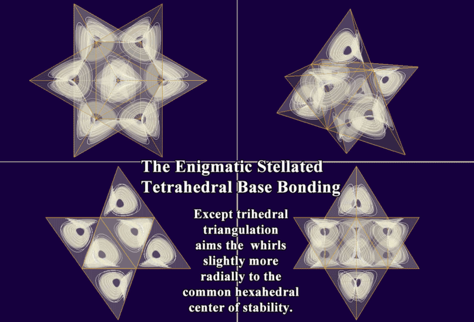 EWT had focussed on classical equations and constants to determine geometric relationships, whereas this webpage is only exploring several polyhedral structures. This star tetrahedron model omits the central tetrahedral vortices, (graphically speaking), which poses further open questions about the differential properties, of "thorough solidity" as in classical tetrahedrons versus "surface solidity" (of trihedrons), and both concepts raise open questions.