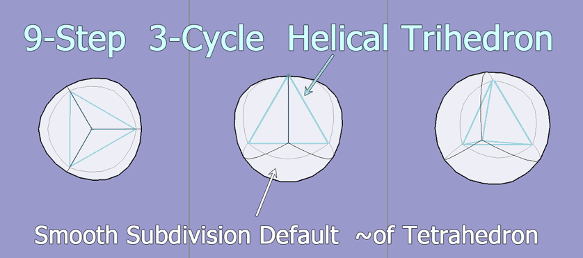 Other parameterized tools, (generally known as smooth geometry for curve and surface editing), were partly explored for helical modeling. The following is a semi-transparent model based on the same 3 cycle, 9 step, faceted-helix. The value of this type of smooth object would be to further explore possibilities of internal-particle-sphericity, omnidirectional, trihedral spin and conceivable properties in 3D space. (The model below is a simple conversion from a facetted version of the helical tetrahedron into a default smooth object. Smooth tools provide for multiple solutions of varied forms, which at this point are less pressing to review. The default crossing faces deserve exploratory editing.