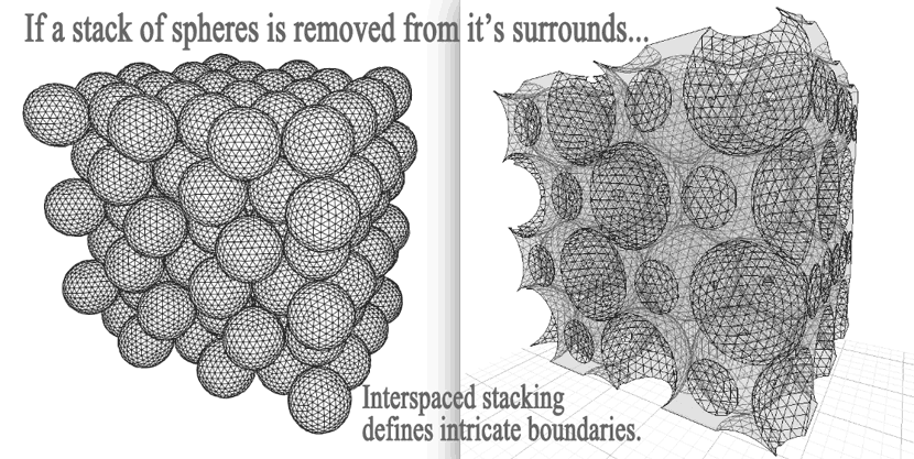 The next model below represents rows and stacked spheres, all sliced to show another version of Interspaces The (green) object on the left is used to boolean-difference the (tan) model on the right, the differenced result of which reveals an unbroken, non-linear, networked space. This version of networked interspace is just one example of many possible varied networks of interspace.