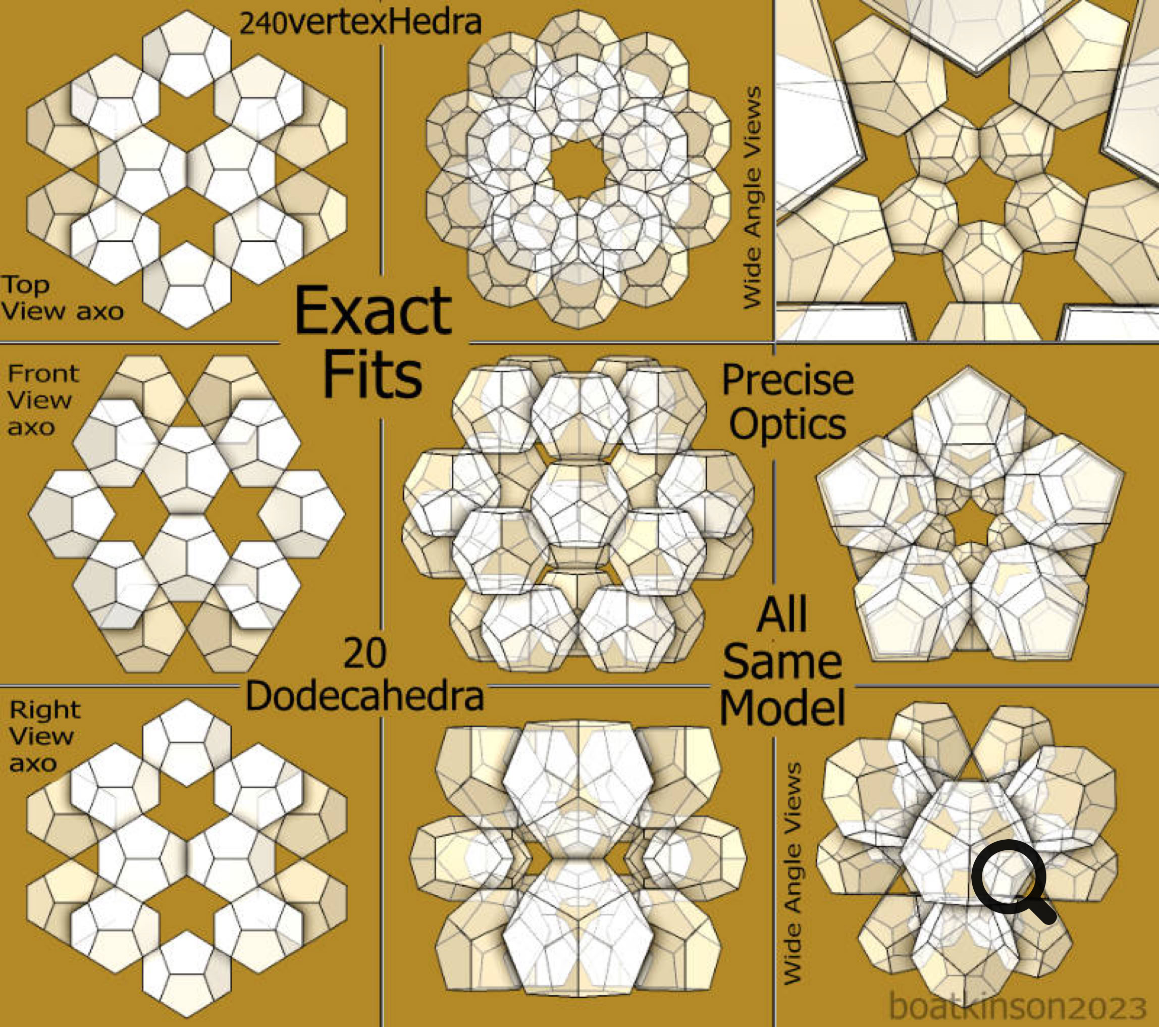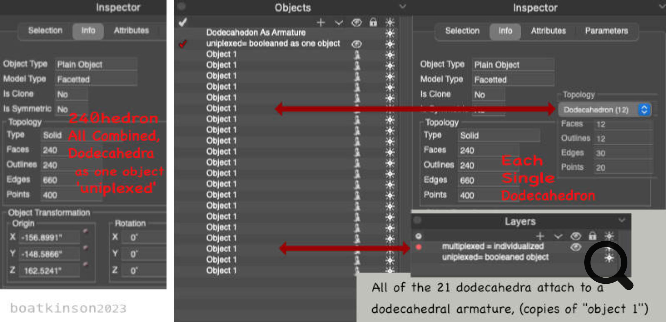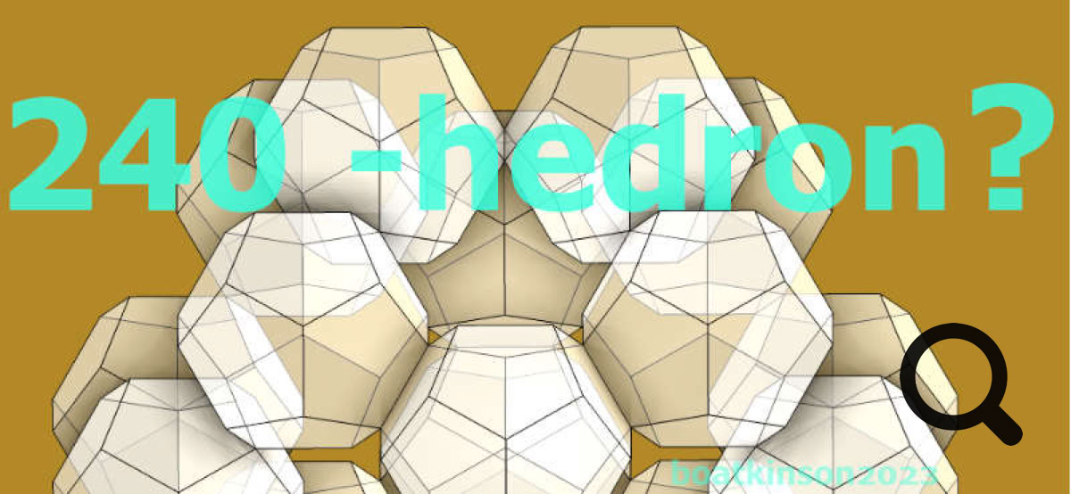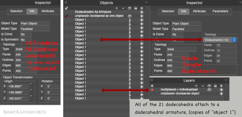 Originally, the 240hedon and 360 hedron were modeled by moving and snapping center points placements of smaller sized dodecahedra with a tool which cloned each copy as it was moved into place. Following that, just one dodecahedron was upscaled in size as all copies simultaneously grew in size. The manual scaling toolcould simply click on the midpoint of the activated tetrahedron and drag it towards the approaching cloned- dodecahedron, (to snap on its midpoint).