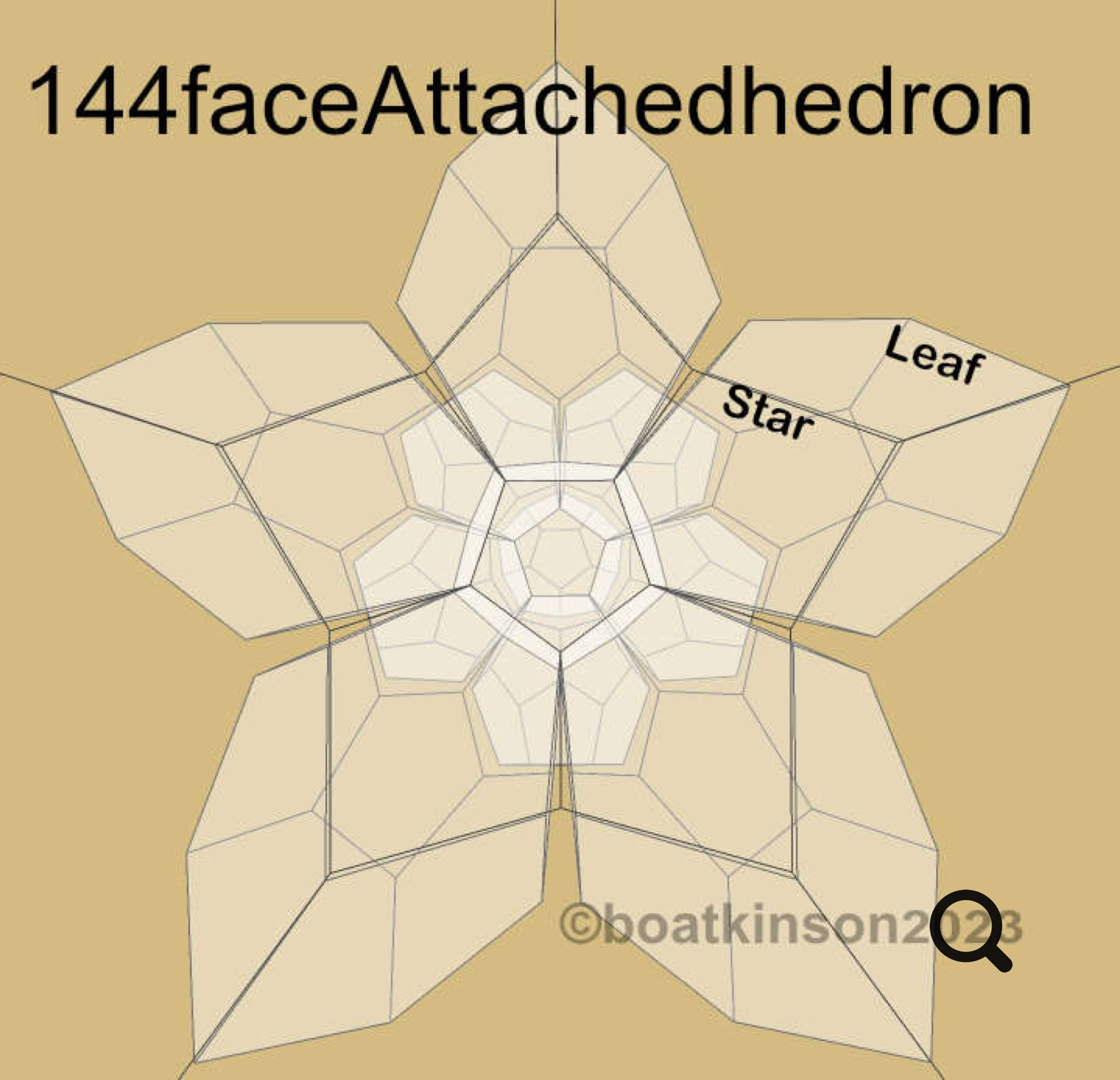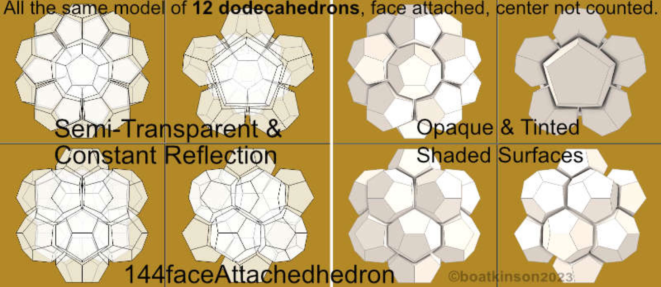 Next is appended another and less complex class of face-attached -hedrons, contrasting the vertex-attached and edge attached.Twelve dodecahedra add up 144 faces or -hedrons, and lesser detail of fewer faces present less 2d patterning to explore.