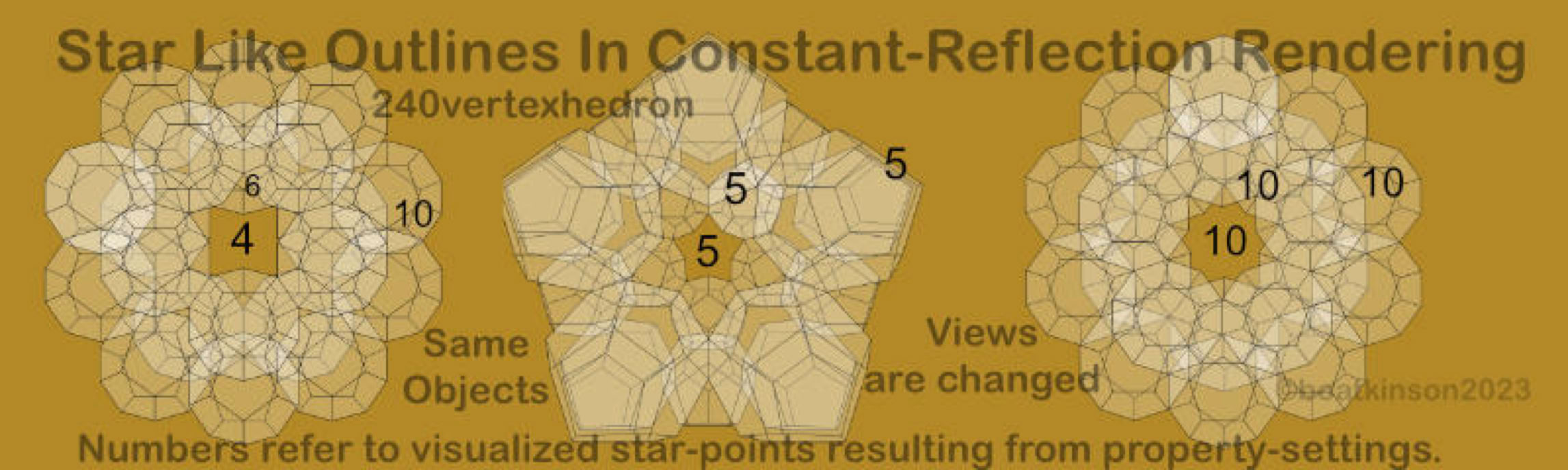 Originally, the 240hedon and 360 hedron were modeled by moving and snapping center points placements of smaller sized dodecahedra with a tool which cloned each copy as it was moved into place. Following that, just one dodecahedron was upscaled in size as all copies simultaneously grew in size. The manual scaling toolcould simply click on the midpoint of the activated tetrahedron and drag it towards the approaching cloned- dodecahedron, (to snap on its midpoint).