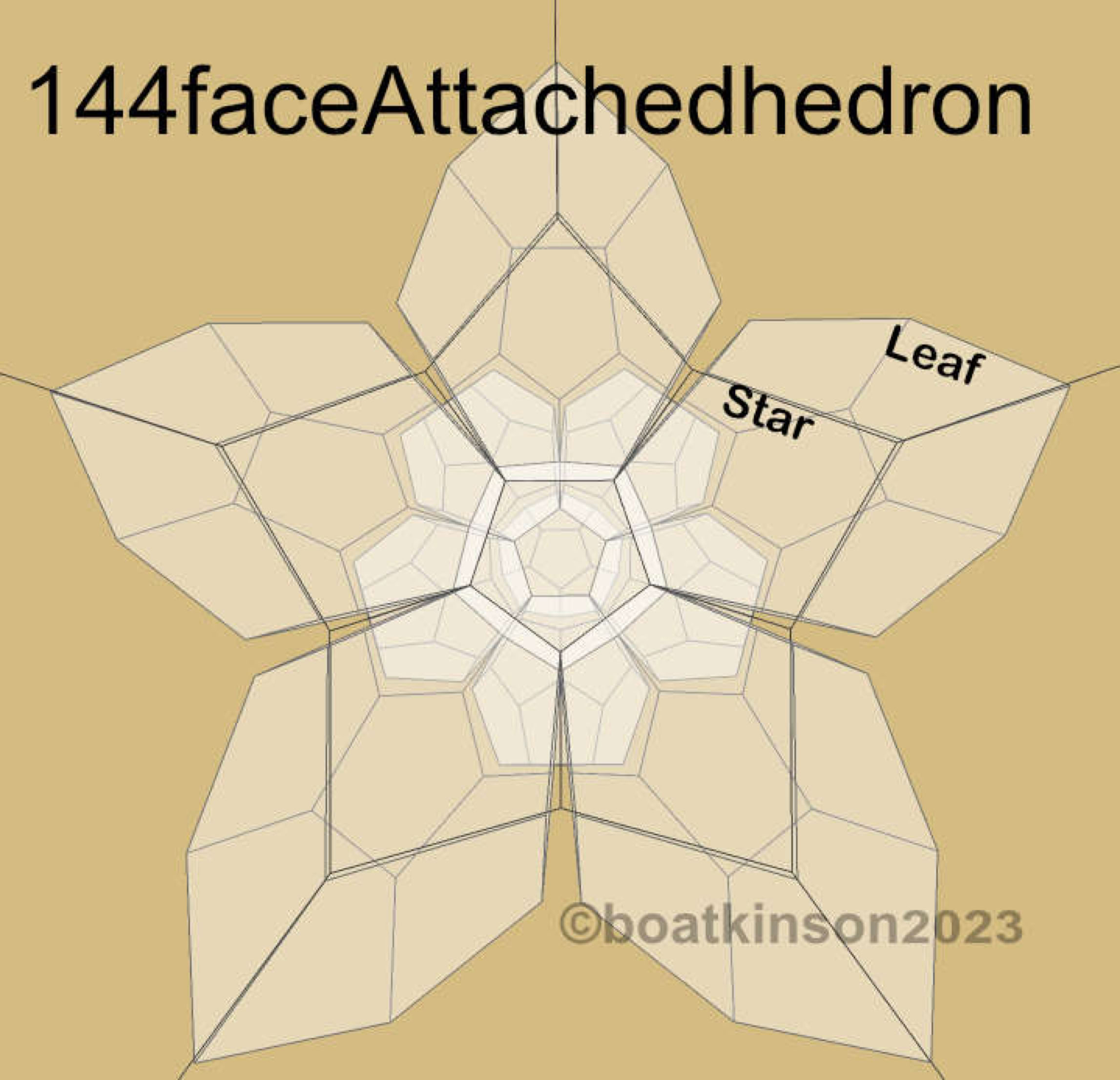 Next is appended another and less complex class of face-attached -hedrons, contrasting the vertex-attached and edge attached.Twelve dodecahedra add up 144 faces or -hedrons, and lesser detail of fewer faces present less 2d patterning to explore.