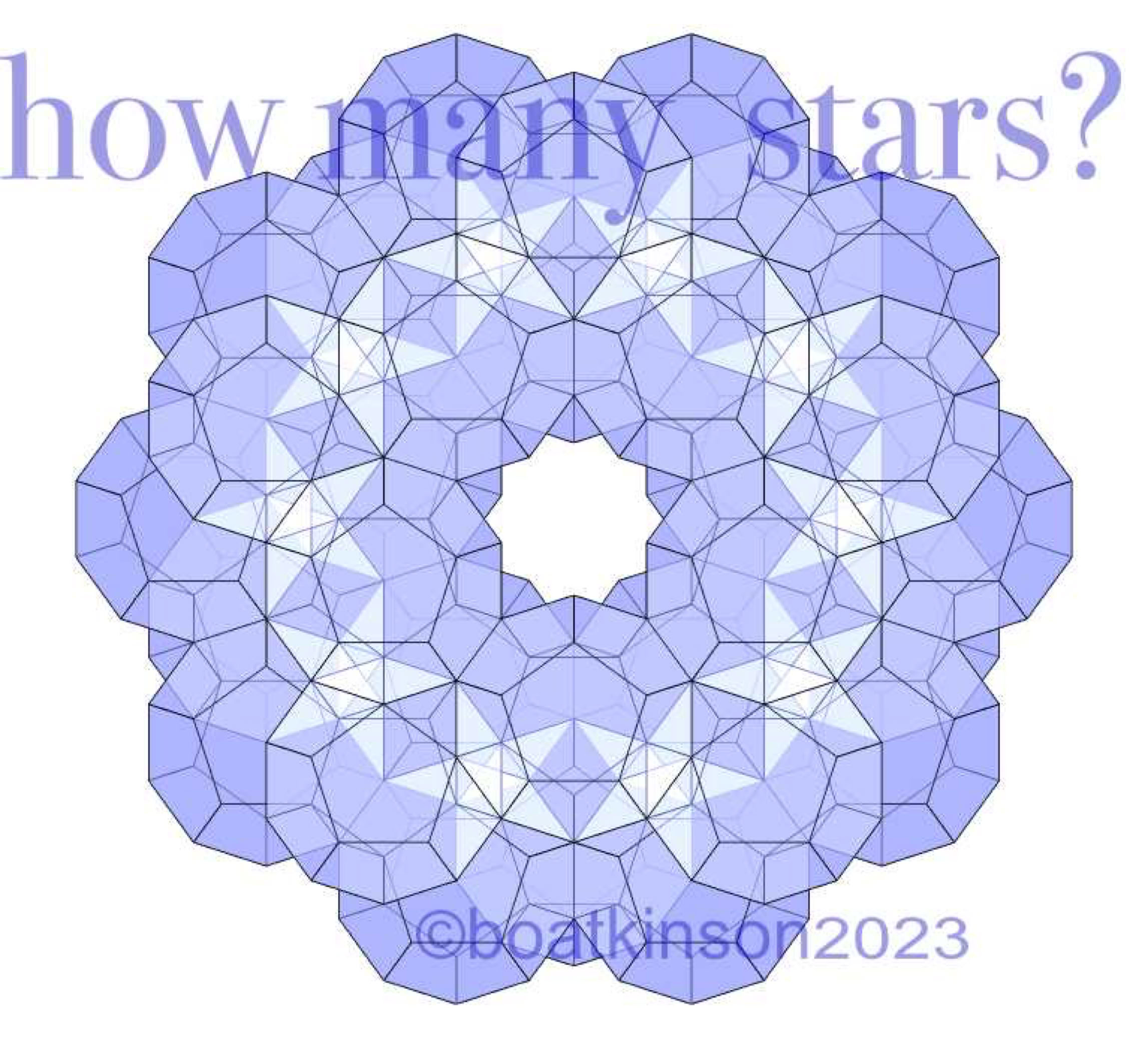 These stars suddenly jumped out as the routine render settings were adjusted, and the main difference in settings was to deactivate shading. This render was an unexpected surprise, that the same model discussed on this page, identically composed, should reveal stars in a cluster of dodecahedrons, and only due to mathematical properties.