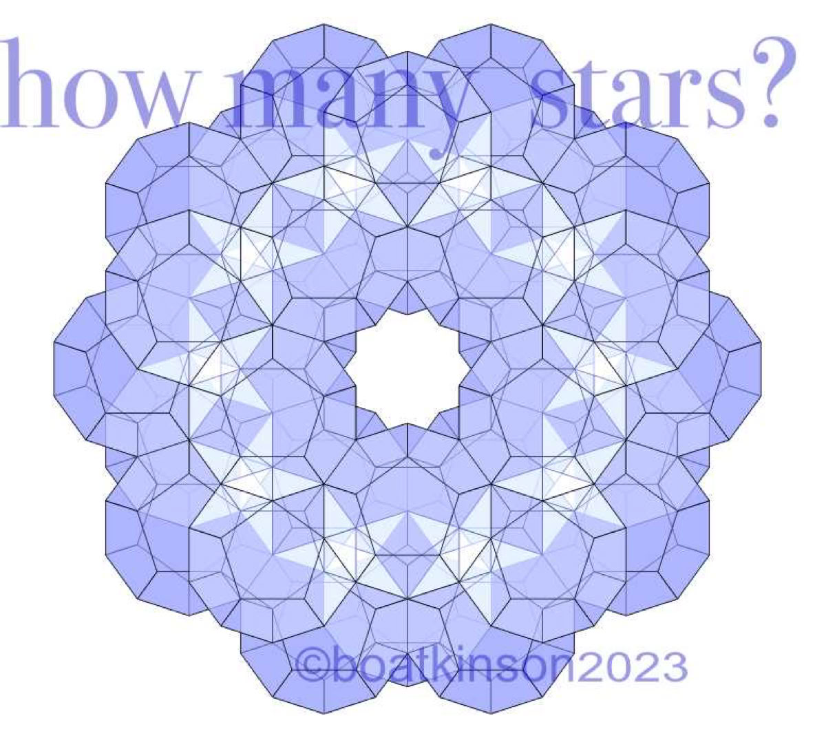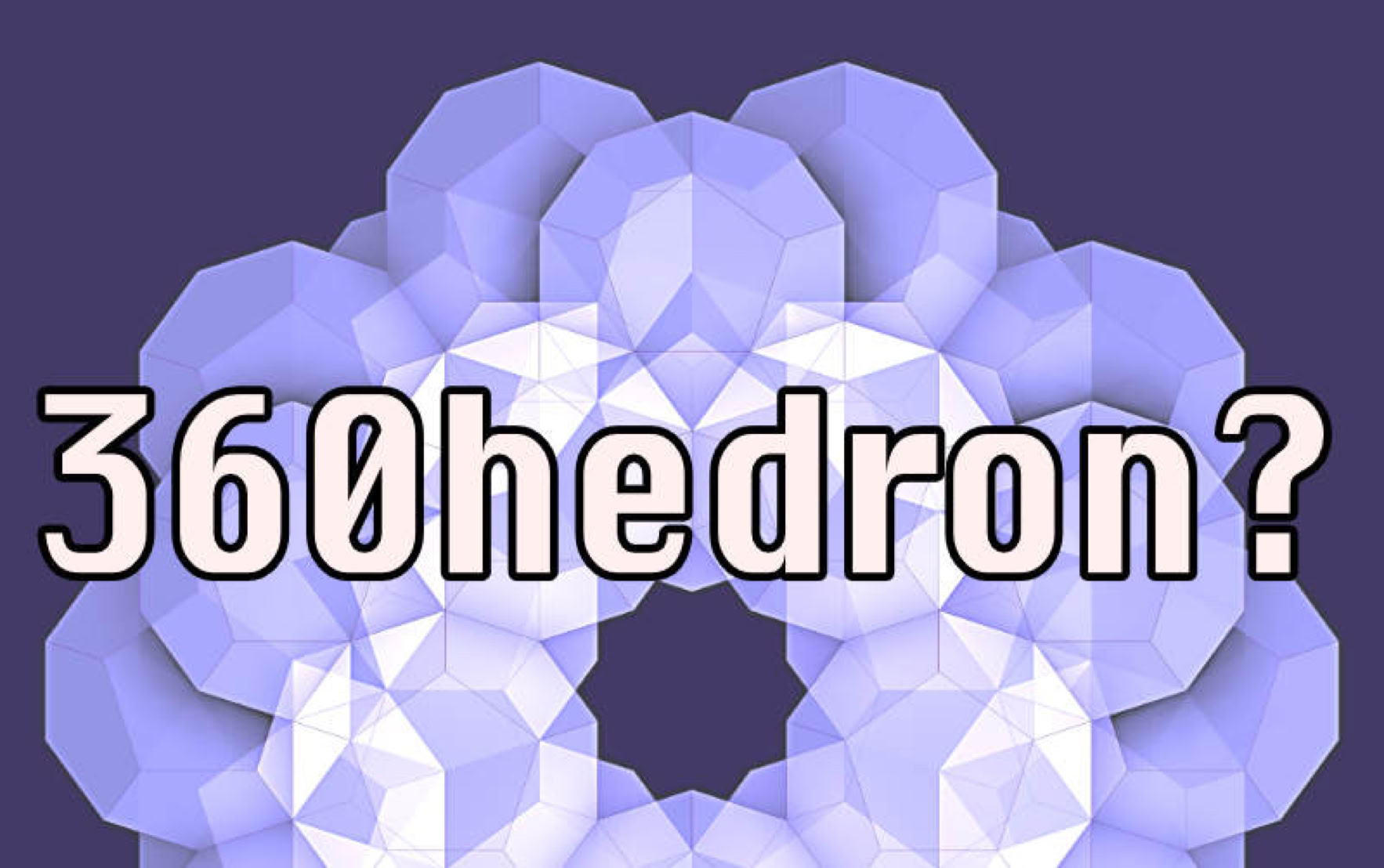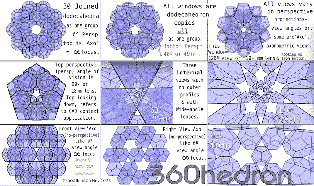 Thirty dodecahedrons have been grouped together as facetted geometry, and grouped as a somewhat spherical outer form, where edges meet. The general form can be made into one object which will then consist of 360 identical faces, because 30 dodecahedrons X 12 faces each = 360 total faces.