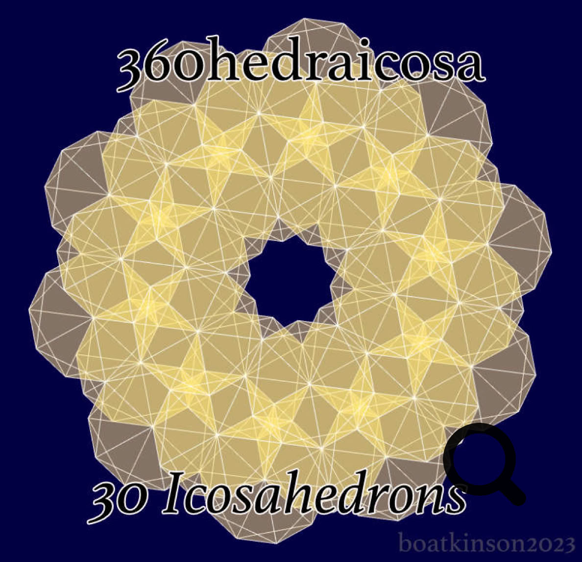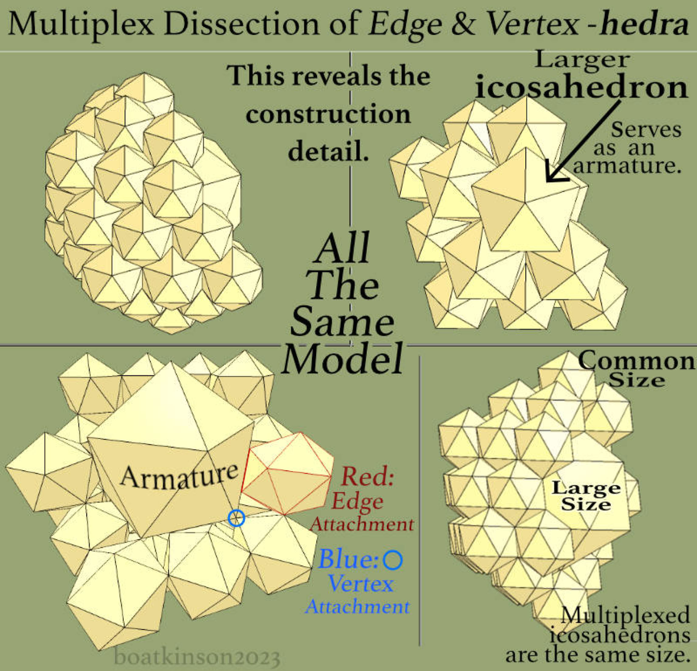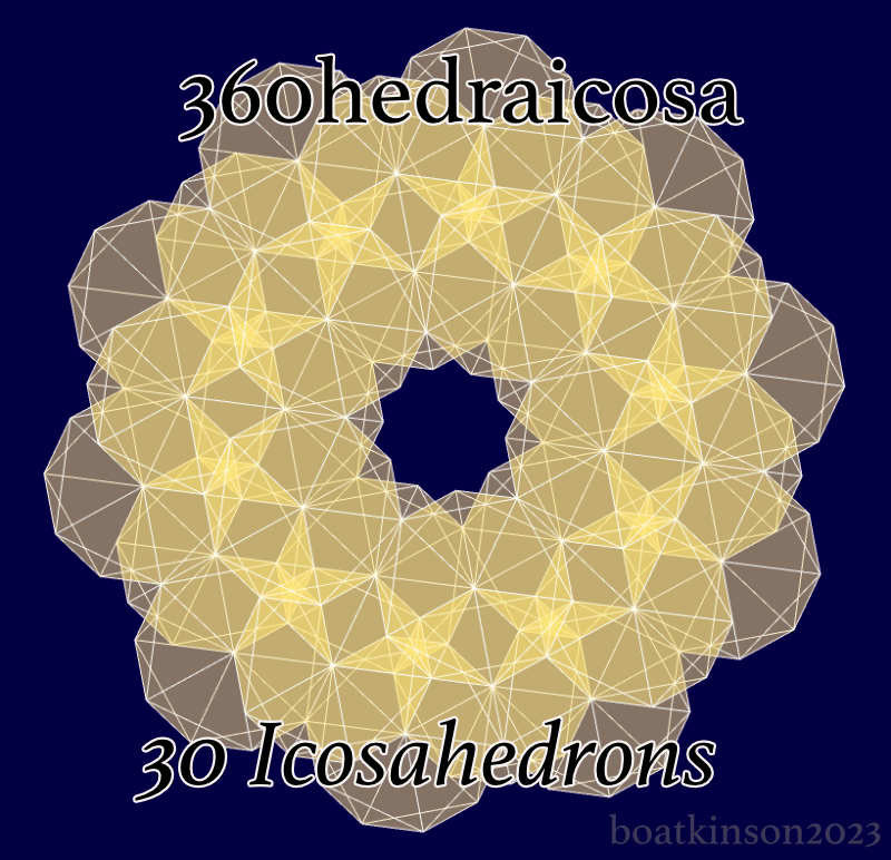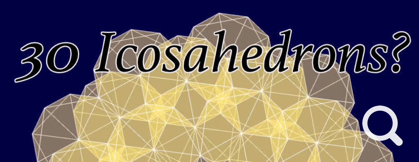 Thirty icosahedrons, (or ‘icosas’), are placed on the thirty edges of one icosa, and precisely scaled in volume such that each icosa just touches their neighboring icosa, and the original icosa at this point is larger in size than others. A word was needed to describe this kind of “concentric clustering” and the word ‘multiplexing’ might suffice for now.