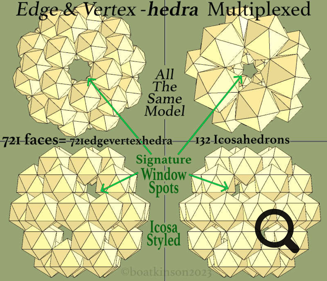 Unfortunately, the geomety app used an convention of doubling the count of ‘edges’ and ‘faces’, due to the considerable task with coding at various levels, therefore some of the figures included here are double or halved depending on conventions used. In due course editing might clear all this up, but too mach app complication for the user presently prevent fixing the, and the visual-mental focus is deemed adequate for www publisjing.