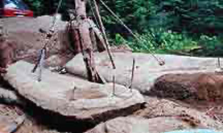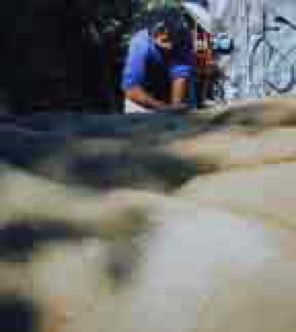 Larger shell structures may call for tensile reinforcement like Ferrocement. FC has long been an experimenter's art form which only very recently is becoming code regulated. The essential idea is to finely distribute steel into a thin shell of concrete. FC has only rarely been used in sand molds, having most often been adapted to other mold systems and non- mold methods as well. While I explored many variations of these I presently focus on minimal steel use in contoured thin shells. I tend to prefer wire and smooth bar over other modes of tensile reinforcement. Overlapping meshes or overlapping hooked wires or hooked bars is often entirely adequate for tensile connecting, (in my mind at least). I never sew together meshes any more. To hold meshes down, I use weights like a hand fulls of cement or concrete. Stones serve well on flat work and sticks can hold vertical mesh. Often enough, once the cement has been applied over the whole mesh, it imparts sufficient stickiness to hold the mesh or small bars. The property of thixotropy or tendency of cement to gel soon after placement also increases the tack. An occasional stiff wire-- pin, clamp, clip, crimp, tie or such is also handy. Welding can also be useful with critical bar reinforcement but so much can be done without welding. Generally, time is teaching me that excess steel is not really effective where much less steel can often serve equally well. I build bear sized sculpture by first hand forming a sand plus water core. Then cement is applied to the sand core as a sculpted shell. Steel reinforcement is embedded between according to strength requirements. Short chain pieces can be anchored in for later hoisting. The point here is that endless improvisation is possible with rough and ready technique .Countless suppliers offer a variety of fibres for mixing with cement. I've lost interest in these, primarily due to clean up prolongation and potential interferences with quicker finishing. Also, random fibres are less efficient than anchored bars and wires, my favorite reinforcement. Where mesh is desired, this can be applied just after the first mold skinning described before. My objections to mesh use include..... The difficulty of fitting curves, since meshes can really bend only in one direction. Deforming mesh spherically looses intended, manufactured mesh integrity and is exceedingly labor intensive. Cut mesh punctures gloves easily, wasting gloves prematurely. I prefer using hand woven wire for unique art. Smooth steel is available in hard or soft and in bar stock or ordinary wire. The cold rolled bar from steel yards is good stuff, a little more expensive than soft wire, but rated stronger. I really like the straight long, 1/8 inch, (3 mm) cold rolled bar. These can bend and weave easily by hand, (with a "J" or "U" shaped hook, at ends). You can space them apart and run them parallel or singly. In some cases, weaving makes sense, just a little like an under woven baskets. It's not so hard to learn intuitively. You can poke straight ends in the sand mold for later bending and anchoring in other work.