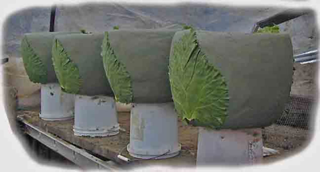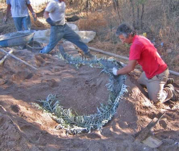 Sand or loam can also advantageously cover the cement sculpture to conserve moisture during cure. After pulling small sculpture out of the sand mold, I like to nest my smaller products in a stack. I do not brush the surfaces yet (and also leave any leaves for fossilization intact). These provide extra holding power for moisture during the cure. I fill any freshly molded basins with a little water. Then I wrap the stack with plastic sheet. I simply overlap the plastic and clamp it shut, in close pin fashion. When needed I can add water through the top from a garden hose spray. This keeps humidity high inside. The sun will then heat up the products for an accelerated finish cure. Where the entire mass can heat up almost too hot to touch, I consider a day or two sufficient cure finish time. (More days if lower temperature is reached). Larger pieces are best left in the mold and covered. Where plastic sheet is not desired, a layer of earth is a great substitute . More watering and time will be needed to compensate for evaporation. Combining damp, sandy, papery or cloth like material with plastic vapor barrier is even better. Cure Testing