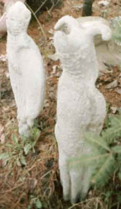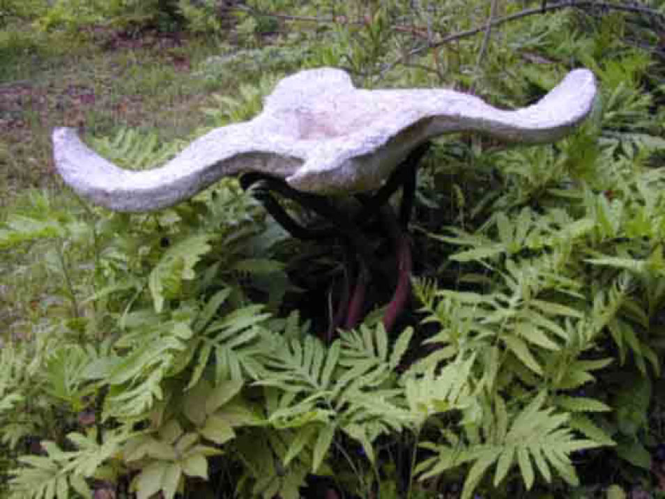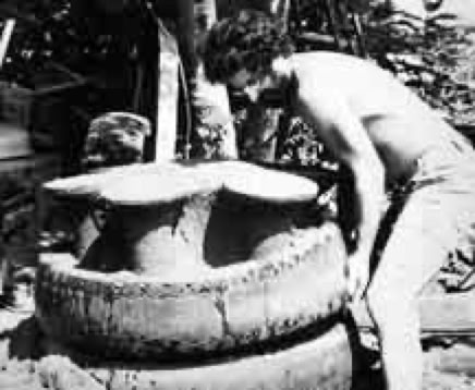 My earliest cement work used laboriously tied mesh in ferrocement (FC). I also did furnace and foundation work with wooden forms and other mold materials. Casting cement in reusable molds began to feel creatively restrictive to me. Too much wear, tear and clean up, storage space and work effort to maintain. Factory-perfect mass production as a model tp follow was not appealing. Rather than repeated productions from the same identical form, the idea of sculpting recyclable forms began to appeal to me. The shapes could vary in countless ways which also appealed to buyers. Also the earthy texture on product surfaces appealed to me, since it is simple to do and also gives an antique quality agreeable with stone. Late in the 1970s, I found that simple birdbaths, taking few minutes to produce, did look good and unique and could easily sell with a reasonable profit. The maintenance of a molding bed was so simple: organizationally, aesthetically and ecologically. More time was available for truer interests and needs. Also, world consciousness was beginning to question the validity of totalitarian commercialism.