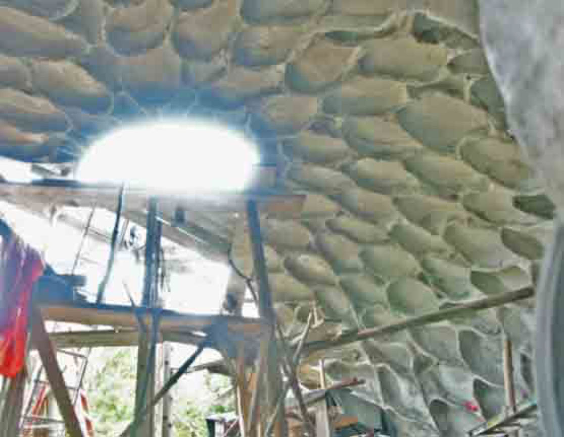 Laminated layers are sometimes needed. The need can be as odd as a change of mind as to thickness or perhaps as a well planned method for adding mesh layers, to upgrade strength of a structure. The need can also be for a finish coat. In all cases it is desirable to achieve a solid product with the least voids between or with no voids trapped inside. Generally, it would seem desirable to apply additional layers the sooner the better. But mechanically, some form work is too fragile for immediate laminating. One might have to wait for full hardening due to minimalist, low cost forms. (There is also some conservationist rationale to consuming less form work building material, too.) Among the fragile types of form work, are large vertical sand molds. Laminating layers suggests two approaches. One is by spraying the other by hand/ trowel. The spray offers an interesting principle of small, high speed impacts of blobs of cement, raining in, to coat a surface, with smaller air or voids between the applied blobs and the surface. By contrast, the hand or trowel sized amounts of cement can trap larger air bubbles or voids. These trapped voids are unintentional. Voids can be best remedied by 'scrubbing' smaller amounts of cement on a surface before patting on thicker layers of lamination. Finer mixes of cement, higher cement ratio mixes, stickier mixes as with additives, all can help reduce or eliminate voids in general. The sprayer looses advantage on flat, horizontal work since there is always rebound, (courser particles bouncing off). This rebound falls back down without the velocity required for compaction. Whereas vertical spraying can reduce void forming, while the rebound falls to flat surfaces below. This presents more clean up and possible wasted cement. Horizontal spraying on a floor for example, can actually trap more inter-layer voids. All of this can be remedied. The comparative advantages are controversial, having to do with budgets for equipment and skills of operators. Most importantly, the scale or size of a job, the required speed of the work progress and situational constraints all affect the choice of method to use. Mechanization of labor speeds labor up and builds larger projects, but the smaller more gradual project has advantages for smaller operations, sometimes with welcome serendipity.