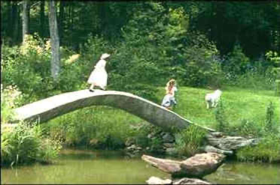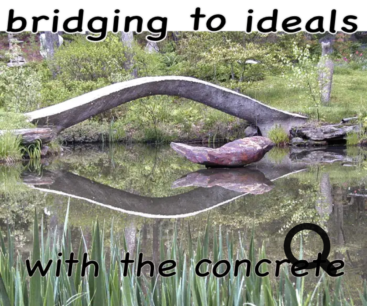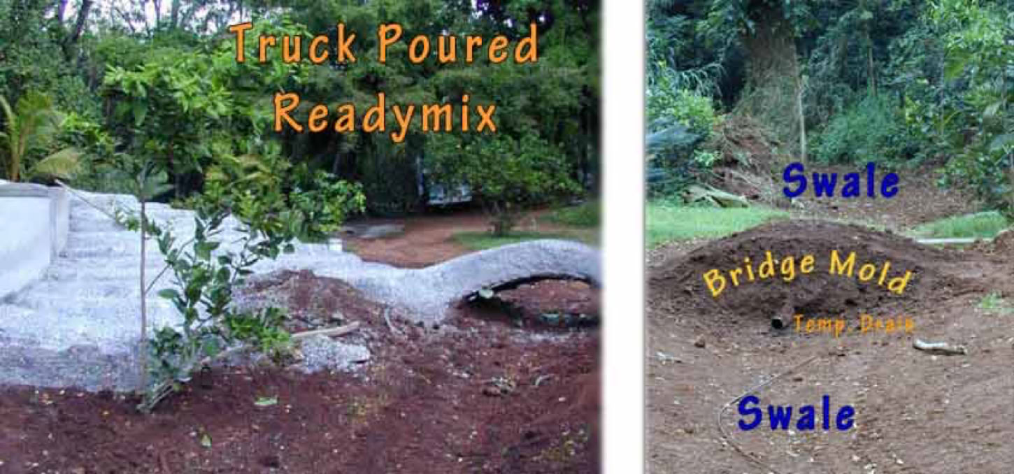 The bridge above was a real photo with kids running over it during a birthday party. It is a 20ft bridge arch of semi laminated Ferro cement, and which was wheeled into place, one end on an axel, and before the concrete filled the thin shell in place. The ferrocement was used as a mold to fill with readymix, after placement.) Sand molding enhances unique versus mass stylized. A timeless appeal emerges versus factory dated commercialism. Below is the same bridge over the same pond, and from a springtime 2025 photo. One of these kids visited us as an adult during the 2025 drought with a dried-vernal pond bed. Ideals remain a mental vision, while our mankind struggles along.