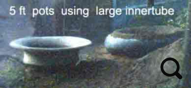 After the cement / concrete has been formed, compacted and dewatered in the mold, the exposed surface can be finished. Often that condition has been adequate, in my mind, with no further treatment. One very nice surface treatment is to simply spray lightly, misting is better yet. The fines will quickly wash away from the surface only. Now larger aggregate is exposed. Curved work will always drain these fines . The resulting pool of fines and water can then be vacuumed out, or perchance they will drain to mold edge. One can leave them or scrape them away, (the water having neatly drained into sand). Another popular wall finish half mists the fresh cement surface to leave fine patterns of exposed aggregate outlined by wavelets of cement fines. In this case, barely enough mist is applied to wash a small area, and the run off is insufficient to stream. Still another very popular finish is fossilized leaves. Beautiful patterns are obtained from leaves of almost any plant or weed. Leaves can be carefully placed on sand molds and poured with stiffer but not too course a mix, (and preferably no excess water in the mix, except to compensate for evaporation during pour). Concrete with larger aggregate can be applied after coating the leaf surface. The leaves produce fossil effects which are prized by customers and clients. I also sold many basins which utilized pretty patterns found inside and outside select tires. Additionally, tire inner tubes offered a completely new dimension for other molding effects. For non-earth, nonabsorbent molding it is very important to use low water mixes since excess water will tend to group and become trapped at the nonabsorbent surface... This will appear as voids on your molded surface. Visible voids like this suggest that your thicker sections might also have voids and this affects the overall strength. I combined sand molding with inner tube and tire molding, so I applied wet mix to sand and drier mix to the rubber, within the same product. The rubber needs mold release. Economical releases include diluted soap, wax or grease. Solution was painted on and allowed to dry. Application of cement could not allow much disturbance of the rubber surface to avoid allowing these releases to absorb into cement. Spraying on a gel coat of cement before cement application, gives the smoothest result, but I rarely fussed that much.