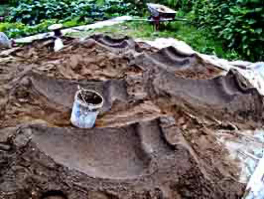 The simple earth molding method described here provides a healthy mix of physical exercise and probably just the right amount of employment if you need income. Sculptural work can exercise the human body in a balanced way, so that we don't over repeat the same identical actions too often. I love opportunity to work with flowing and rounded shapes. The least lovable parts for me were mixing cement and selling products. Nevertheless, considering that I work and live far from good sales locations, the business was still very favorable. Mixing dusty cement outdoors or with exhaust fan allows some avoidance of the dust since the dust cloud can be seen and avoided. But someday, getting a bin system or half ton bag system with mechanized metering of mixes, would sure be nice. I especially dislike the cement dust. It should not be so hard for a manufacturer to supply low cost, reliable metering equipment, just right for the small user. In time I might improvise my own. This would boost my production way up, and my spirit also ;)I love simple sand molds because little time and material is wasted while the environment and worker are less taxed. The sand holds moisture for desirable cement curing. Mold and product are separated easily and brushed off later on. Sand is recycled anew, just add water. This system adapts both indoors and outside, in a tent, or in the sun. All ambient conditions have advantages and cautions to learn about.