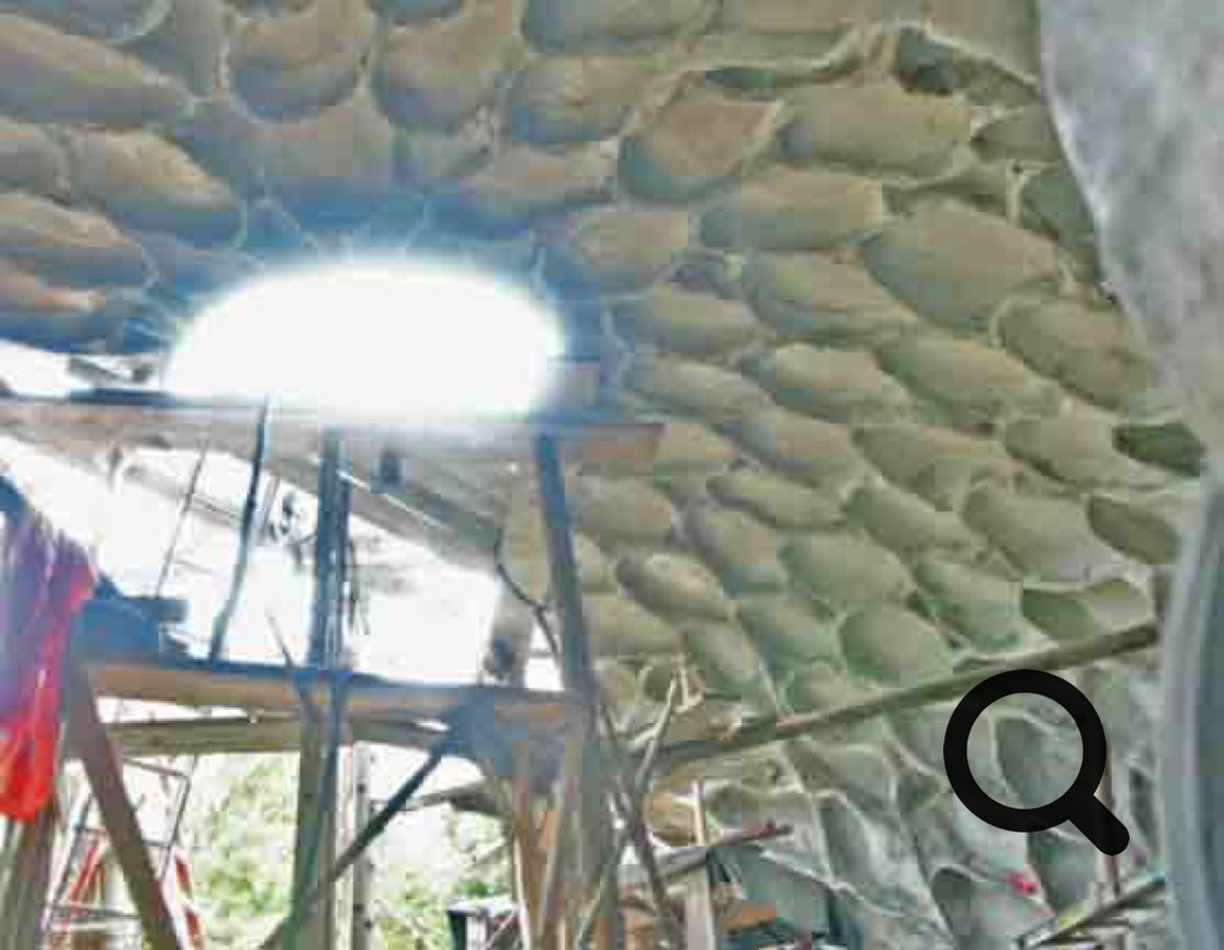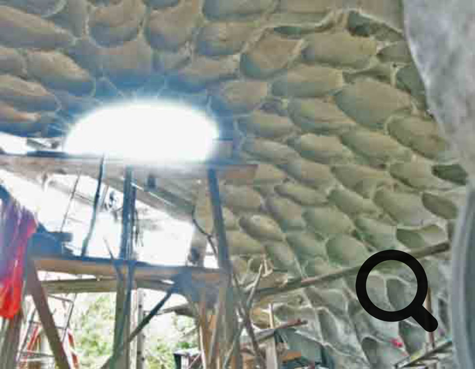 Concerns have been raised about vault acoustics. Acoustics can be controlled by use acoustic materials or perhaps more interestingly with coffer structures. Coffer form work can be added to the circulating vault with an added bonus of inherent-reinforcement possible. Coffers are found to greatly minimize echo due to the physics of sound wave interference. Here is an example of organic coffers, a form of truss work copied from mother nature. Below are coffers in a 10M or 33ft dome under construction in the summer of 2006.