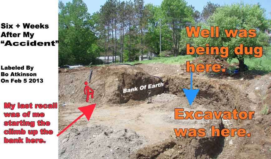 It could not be explained socially, for lack of immediate-in depth-proofs with support. My conscience was mystified for lack of better explanations, (as so little was evident at that time). During the ensuing trauma of great head pain and perceptual disorientations and other interuptions, I held to my trusty conscience. I accepted my condition even if others supposed it was my willful fault. I later contemplated how my memory couldhave blacked out for that period of time. I concluded that: It had blacked out before I was hit! yes, I blacked out before I was injured! But how could a blacked out person climb a dirt bank and stand in the way of big, busy excavator? This was a mystery to struggle with internally, (contemplating it for years afterwards). I felt ready in 2013, six years after the attack, after my internet research as well, to clarify my assertions, by writing this webpage. Despite likely assertions that traumas ruin memory permanently. I differed, based on continued, clear and thoughtful analysis, and continued recovery. Here are additional pictures, of the physical evidence.