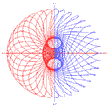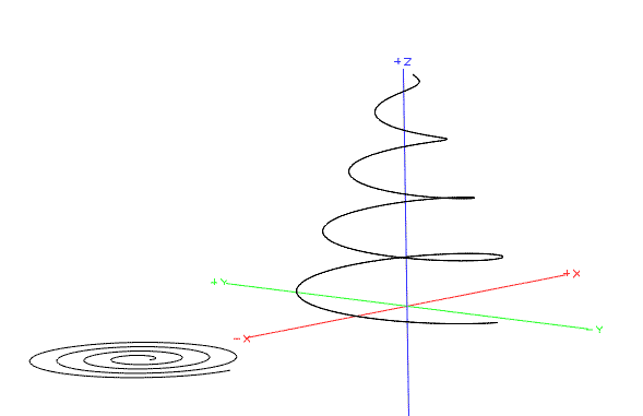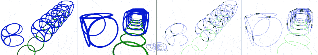 Here we show the same view angle as above, displayed on the left, (with no perspective). One significance of this view on the left is that the blue helix also bears an imbalanced profile. Though this particular imbalance occurs only at specific points along the source-path. The flat-projection of the blue helix reveals helical orthogonality. Could this correspond to magnetic lines of force or EMR patterns? Are magnetic 'lines' independent circles distributed along a conductor wire? Or could these force fields actually be helical in nature?To the right is displayed a perspective view of same model, to verify the ordinary spring-like model. I applied this helical orthogonality inter changeably in coil winding: