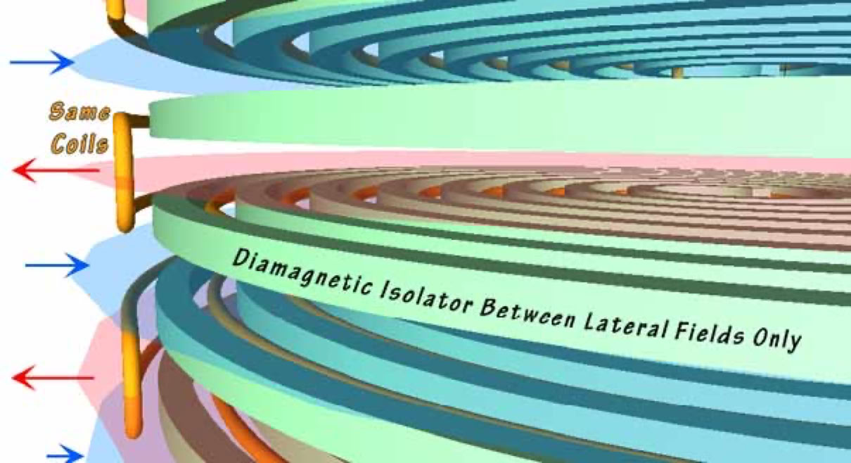 Next Below: Pancake coils emphasizing the magnetic fields wrapped around each coil conductor wire, the full length. This can be achieved in a variety of ways. With wrappings or by embedding wires in a castable, magnetically-specific composite-- Made to match a specific frequency range and....