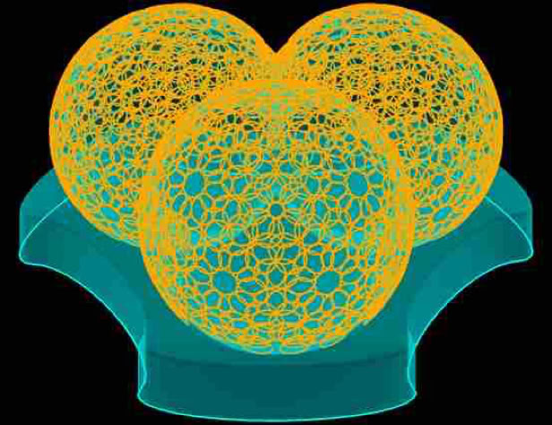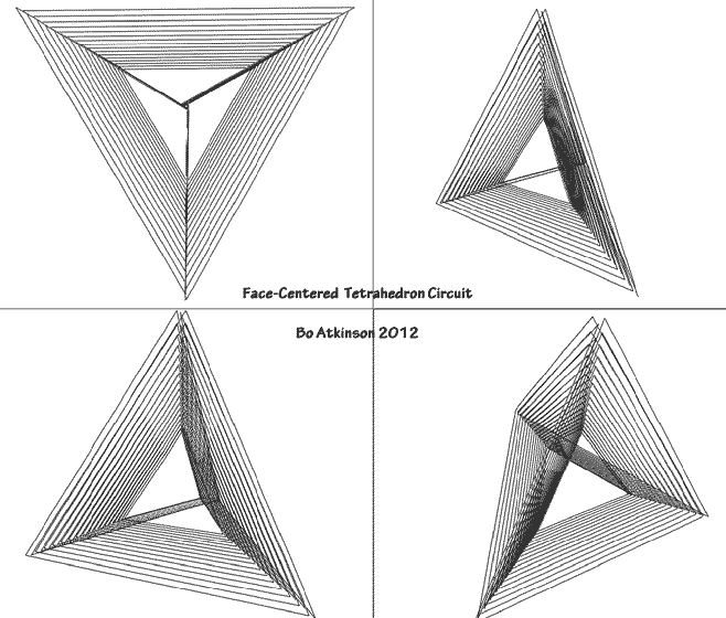 This is a complex coil wound around sphere. The software Clipping Planes manage to isolate the view of one turn. I model these paths to help formulate buildable experiments. Regardless whether the production setup is ever kick started.The polyhedrons provide endless outlines for energizing new field patterns. One of my favorite polyhedrons is the tetrahedron. I spent a lot of time modeling and imaginingexperiments for energizing tetrahedrons and derived shapes.