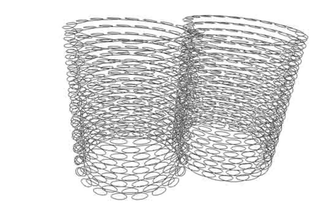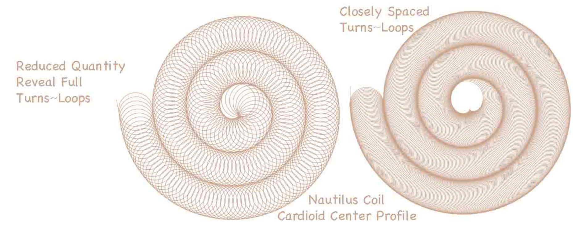 Also, another pattern of interest is the flat, nautilus coil arrangement. I found it interesting that while modeling this with precise software tools, a cardioid shaped center resulted.