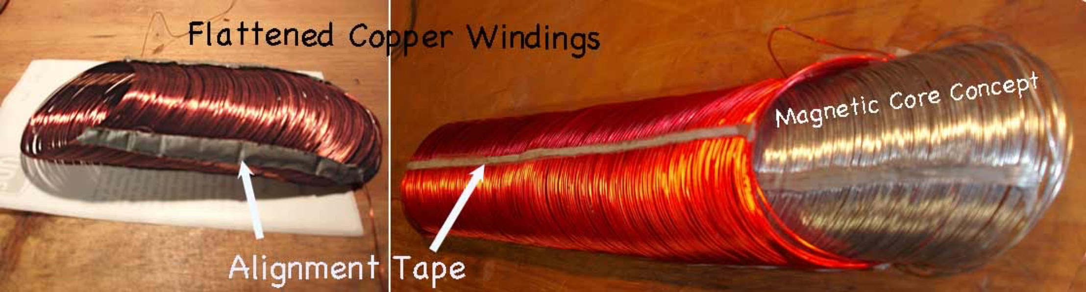 The newer special windings could compare with the plainer flat windings, (as pictured below), with the objective of advantageously modifying the resultant magnetic fields, due to the tightly parallel windings which might adequately maintain a unipolar effect.