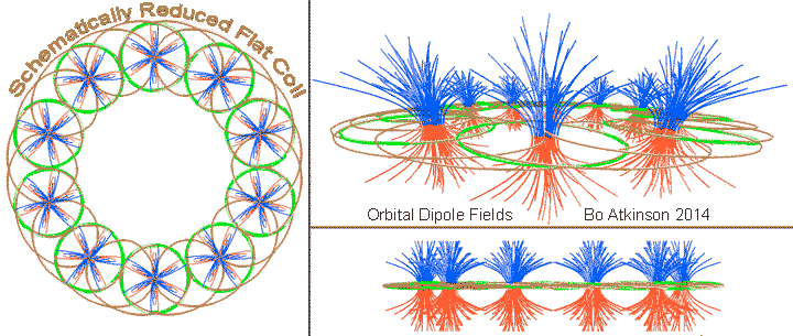 A Thought Experiment: To see what effects orbiting, electro-magnetic fields might have. In this experiment, magnetic fields will be energized electro magnetic fields formed by loops (or turns) of pulse-energized, physical-wire-loops, or sprilae, (fractional orbitals). The visualized, magnetic fields are polar, indicated by traditional red-blue lines of force. The simplified concept above suggests that pulse timing could energize loops and speedily orbit the magnetic fields. Fewer loops are spaced apart to simplify the principle schematically. Greater quantities of individual loops are intended for flat coils (as visualized further below). I invite comments, (but cannot enable visitor comments on my low cost website).