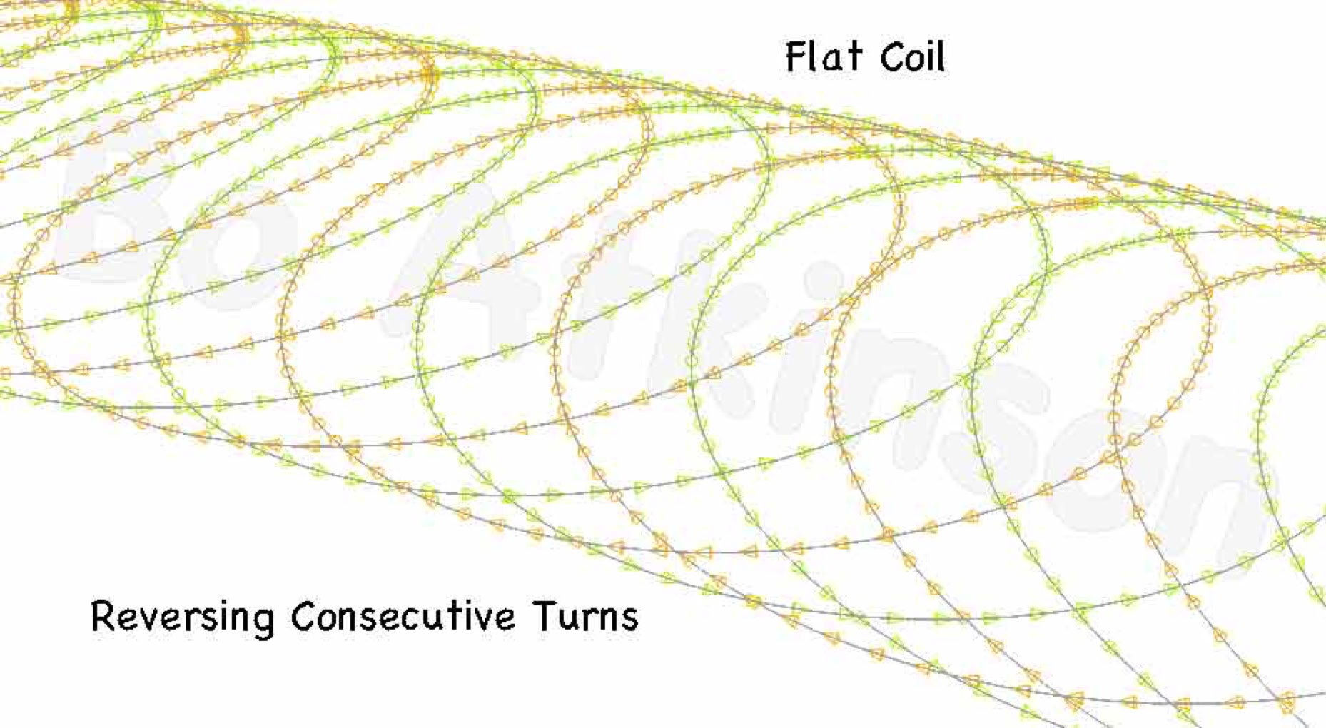 Contemplating the use of plain AC, (alternating currents), inspired the concept of inverting consecutive turns, in a flat coil. First consider just one set of inverting turns: