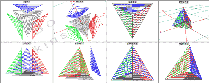 Next is a view at a slightly different view angle. Notice also that the spacing of the wire frame models vary. Each model is utilizing a different ratio between the source path, equilateral triangle and primal helices. (These may yet be adapted to more intricate frameworks like my Fractal StarTetrahedron. Visualizations of the expected trefoil, Split pole, field effect, will be added in future.