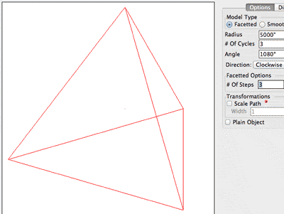 In February 2007 I modeled and observed helical structures wound around basic geometries including the equilateral triangle and by adjusting the input parameters discovered the striking resemblance to the tetrahedron, or trihedron as described above. The convergence or transmutation of two dimensional (triangles) and three dimensional structure (polyhedra) was questioned, as a hypothetical explanation, (hence the previous suggested name Primordial). The three apexes increasingly converge with the increased ratio of helix diameter to the helix path, (and structured with straight segments instead of curves). This peaked curiosity about the classification of “2d vs3d”.
