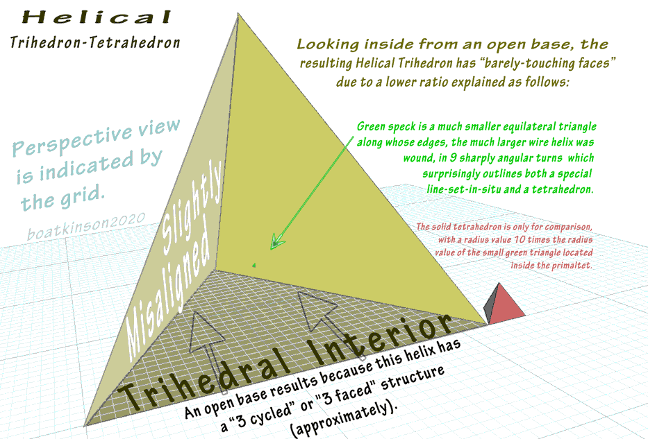 The fact that an absolutely ea qua lateral tetrahedron is not made by this verifiable procedure, actually may yet prove useful. It may render advantages in case the helix path could become a solid wire. (My own interest in this particular regard is drawn to using bi- filar wire segments of each tetrahedron leg-- In order toproject and arrange electromagnetic fields. The "slightly mismatched" vertices can represent the width of bifilar arrangements, as these would 'angle' at the vertices. Also, the slightly shorter stature of this primal tetrahedron may be discovered to provide other significant features of field projections. (However, a comprehensive investigation has not been made, regarding just how closely, a helix can be adjusted, to match equilateral tetrahedrons.)