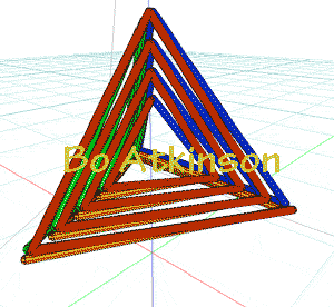 The helix radius in this example immediately above, is many times larger than the triangular source path radius. (Ratio differences at work). These are screen capture images from 2009, (using formZ):