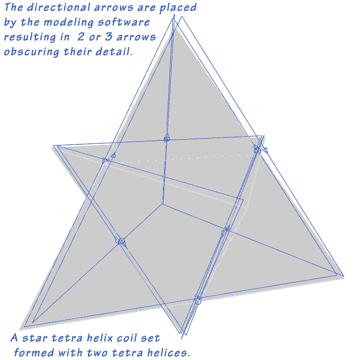 Further examples may be seen here. Electrical circuits for these would interconnect by mid points and by vertices, dependent upon the assembly... There also remains the fact, that 3 legs of the primal tetrahedron (heli-tet?), have wires with opposite alignments (or polarities). While the remaining 3 legs are single wires. I will elaborate on my work with these assemblies as more observations are collected from from experiments. I would have enjoyed experimenting with better equipment and training. My experimental coils are a little crude.