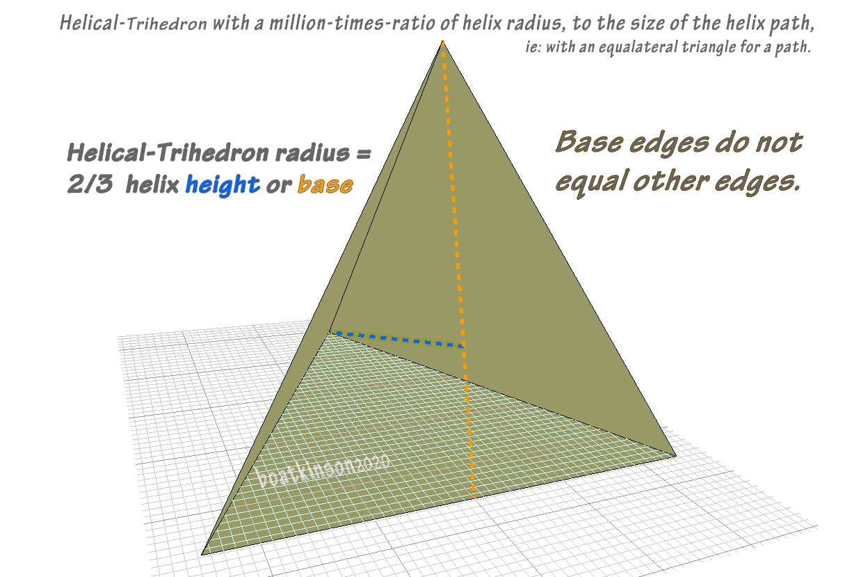 At ratios greater than 100:1, equilateral tetrahedrons are closely approximated. I also wonder if there might be variations of math formulae for helices, wherein a more equilateral tetrahedron will generate. The image directly below reveals a consistent limitation for the trihedral helix. Regardless of very large ratios, there always appears to remain gaps at the vertices. Gaps which equal the triangular pathsegments (or sides). As in "Top#4" view above.