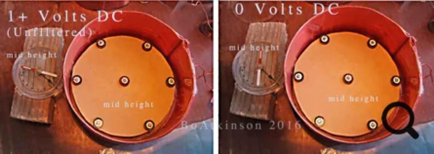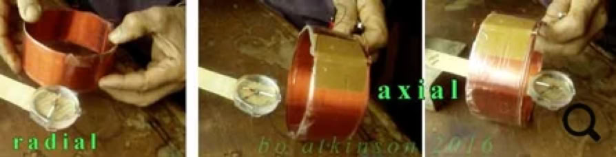 I also tried rolling metal foil, in between… In these rolled up trials, the resulting, axial-only, field alignments were much the same as found with ordinary dipole coils. The radial field was lost. (Note that each end of these rolled up versions possess normal N-S poles, as expected with ordinary coils.) My preliminary conclusion here was that the “parallel radial effect” was cancelled by the continuous roll which laminates layers of doubly-opposing fields, close together. Thus, the “parallel radial effect” cancels itself. I have not tried AC with this rolled up version, instead devoting all my time to the fascinating radial field instead.