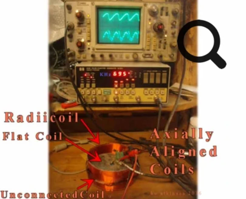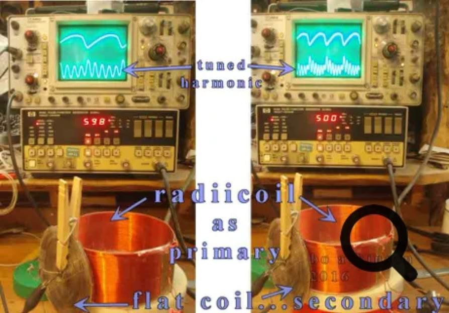 Photo above shows unusual, preliminary trials of one AC effect. The secondary or pick up coil was aligned at various points along the radial plane. (The same radiicoil is used here, as appears in first photo above). I am attracted to harmonic resonance effects, from simple coil geometry, (as contrasted with other sources of harmonics). Coils suggest more-direct interactions with most basic force. In a short time, some good harmonics were noted (in the photo above). Unfortunately, my latest acquisition, (a surplus HP 8116A pulse generator, as used above), came in the mail, partly dysfunctional. (Further explanation is at page bottom).