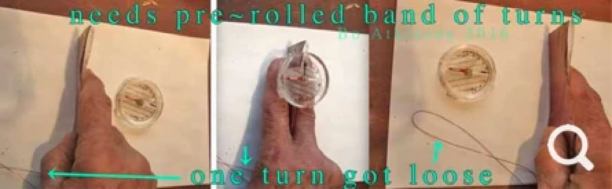 The photo sequence above shows the pass-through of a compass. (Or actually the girdling-past, by the moving coil, with the same effect.) Note how the field defies ordinary axial alignments. The white end of compass needle points to center, at both ends! (Needle reverses if Pos and Neg terminals are reversed). The brown tape holds the folded ends together. These two coil versions were energized with a wall type, un-filtered, DC transformer, (with open circuit at about five volts, closed circuit at about one volt). Next photo below shows the same sort of parallel folded coil, (but with #25 AWG wire), rolled up in snail like spiral fashion. The radial vector is lost in the rolled up versions.