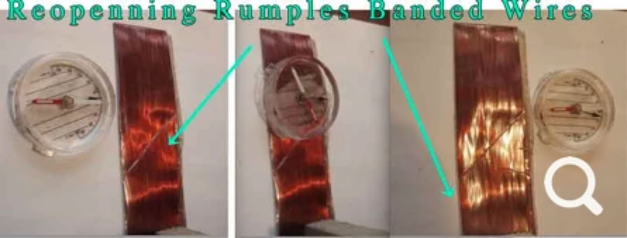 Hand held camera left me just one hand available to steady the band of parallel wires. The compass reading on top of the band (not edge), seemed a little sticky, for the compass needle, (undecided?)… Yet if the needle could align with the rumpled wires, at all, this spurs my curiosity. Otherwise, could it be due to the relative position of the reading taken near to the far end of the band? (December 29 Note: On further testing the compass reading at top of center photo does align with wires again, but just beyond the end point. I believe that force fields are curved and are not linear like compass needles. Also these particular forces exert very small physical effects.) Flattened wire bands (similar to these photos), seem to suggest extreme coil radii.