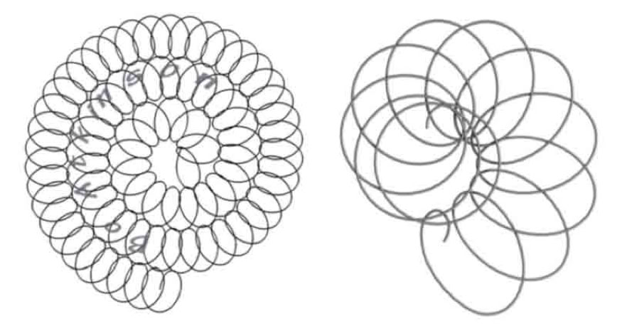 Above: The 'nautilus' spiral would need more than a 100 ft. I have found 3000 ft. rolls of quarter inch black plastic sold by irrigation suppliers. (I'll be trying this here). Quarter inch tubing is easy as rope to bend. Durable tying material is recommended. The simpler 'comma' shape is to suggest abstract shapes are easy.