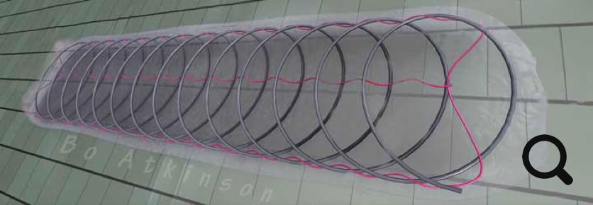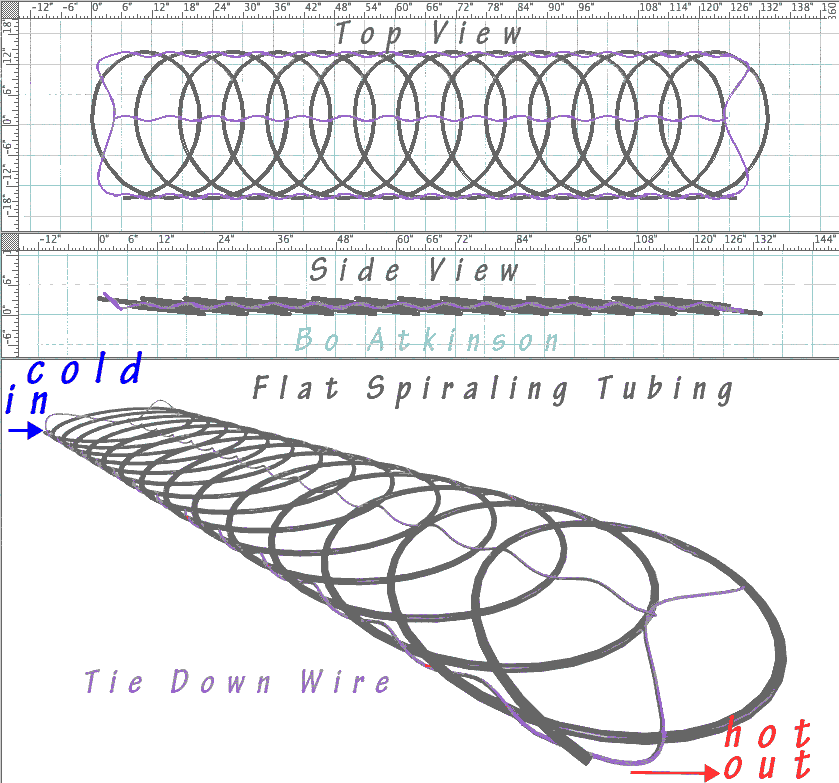 Picture above is a 3D CAD model of full 100 ft. roll of 1/2" black plastic tubing. (Water content would amount to about 1.57 gallons and weigh under 13 lbs). Multiple sets of tubes can be combined to provide larger capacity.