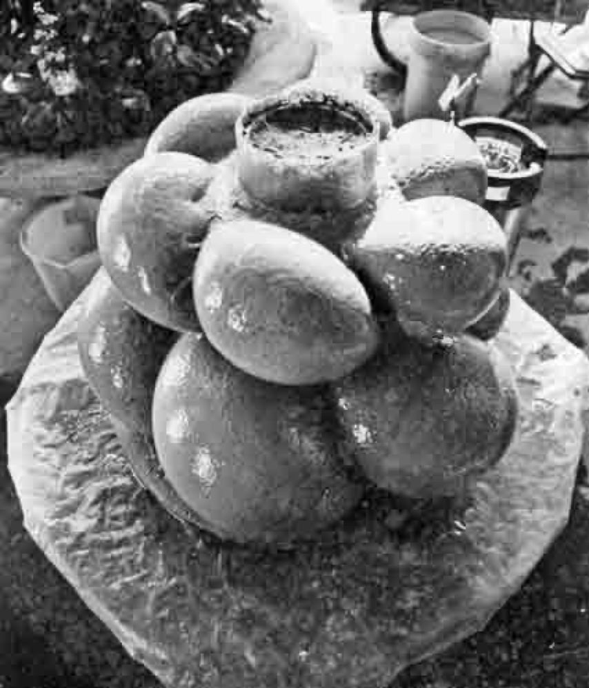 After needing to abandon the 'thin-walled' structures of the VFA, i devised another 3d form with less delicacy, for simplified wood burning. I was still interested in gravity fed bottom burning. Above is the mold made with wire wound tire-inner-tube. It is seen above coated with with wet clay solution to act as a mold release. (It appears in upside down position).