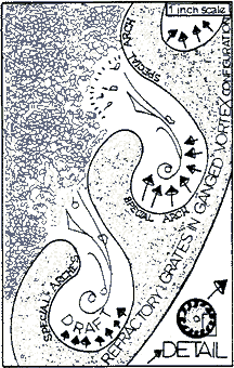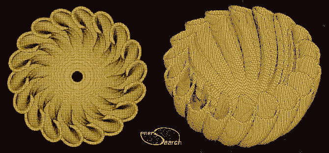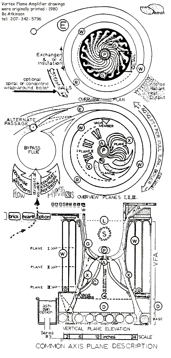 This first enersearch research project was named the VFA for "vortex flame amplifier". The CAD model (at the top of this page) was generated using a 3d modeling software, (formZ) and a geometric form known as metaball. A small report was produced and published in 1981. Further development of this research was suspended, primarily due to my single handed, under-funded approach. I increasing found myself heading into self-sufficency, as a life style, accentuated with occasional small construction contracting.