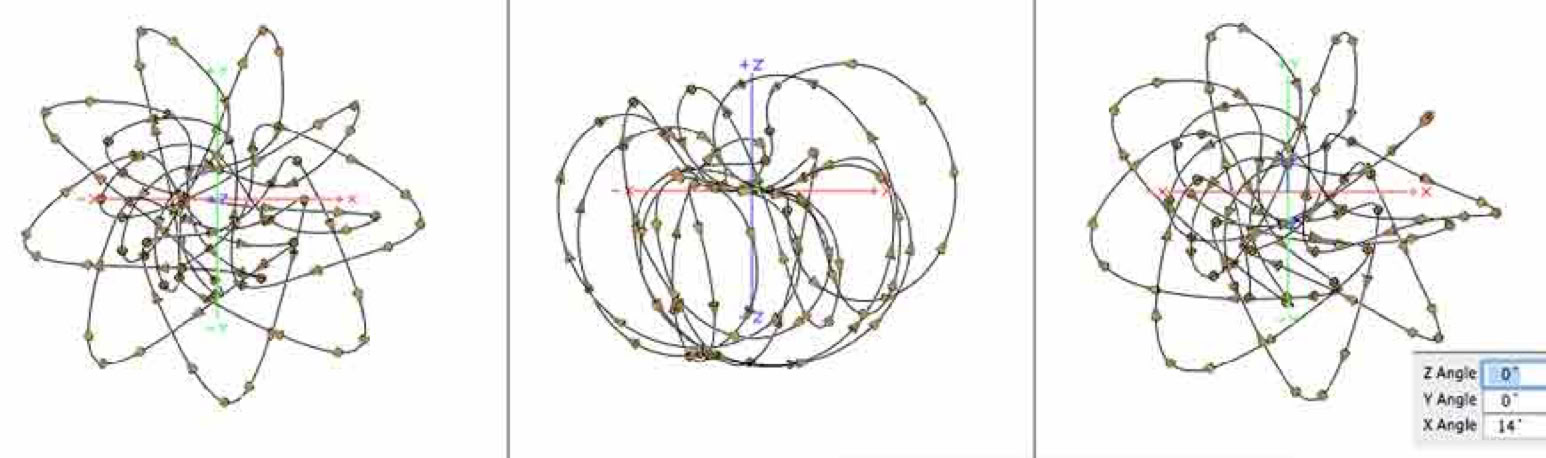 This is a complex coil wound around sphere. The software Clipping Planes manage to isolate the view of one turn. I model these paths to help formulate buildable experiments. Regardless whether the production setup is ever kick started.The polyhedrons provide endless outlines for energizing new field patterns. One of my favorite polyhedrons is the tetrahedron. I spent a lot of time modeling and imagining experiments for energizing tetrahedrons and derived shapes.