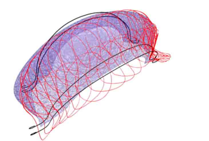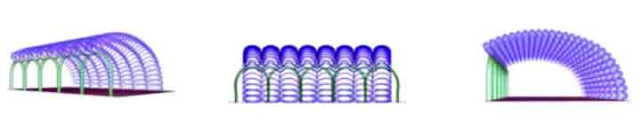 The rings overlap. Schematic portrayal does not necessarily represent the actual ring diameters. More links about rings will be added as time permits. Rigs to easily place wires in wet cement is presently under development.The large wires represent a "backbone juncture" to hold the "purlin/ ribs". The 3D contours embody the structural grid work
