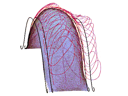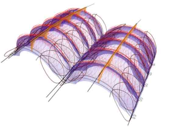 Black rings above portray a truss like layout of undulating rings. The truss itself undulates, following the scalloping contours. Heavier bars are represented by the straighter black lines in the picture below.The outermost edges of the truss ride on the top of the coffers and the inner edge of the truss at the backbone juncture. This explores ferrocement design methods to integrate truss work and ceilings in one unified component. Computer models are available and offered free for the purpose of engineering analysis.