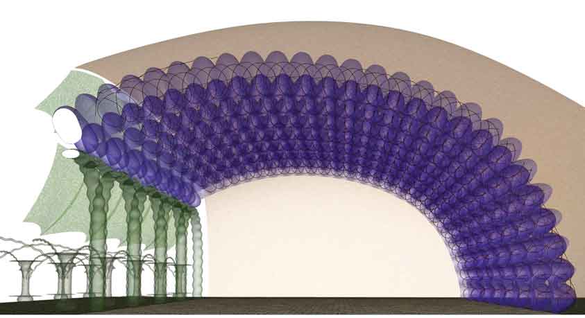 Above is a view from the narrow end of a conceptual vault, roughly 65'X100' or 20X30 meters. Height is roughly two or more stories. To left is shown an arbor concept for growing shade vines for summer shading and winter sun gain to vault space. Colder climates would better consider placing the upper vines inside the vault. Thus, solar gain could continue year round while foliage filtered light is provided to ground floor. Engineering should take local climate into consideration, (as well as to clarify all design aspects). Some sort of glazing system covers the green colored arch area. The tan arch above signifies a large mass of soil covering the entire structure to absorb heat and thereby stabilize temperature year round. .The blue is the focus of this page. It is a thin shell ferrocement grid work of arched coffers. A substantial surface area is presented by coffers which complement PAHS objectives.