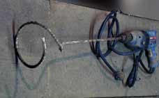 This page discusses moderately priced power tools for mixing mud in common plastic pails or rubber pails. This is a more efficient power tool method than using larger mixers, for working alone and sometimes easier for small work crews, because there is less clean up and more versatility for lifting mud to heights above, which are advantages in hard labor. There are many types and qualities of mud which led me to experiment with differing mixer geometries, as presented below.