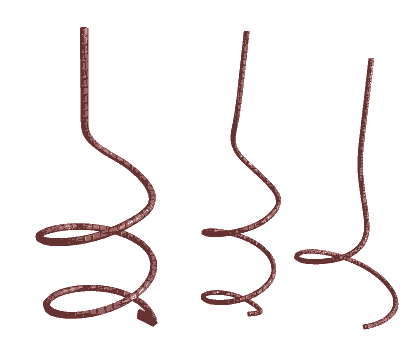 Above: Generally, distance between each cycle or turn of helix could measure near to it's diameter. A slope around 20 degrees, is presently being tried. (This is steeper than car springs originally tested). A slightly tapered, wider at bottom helix is preferable. Rebar corkscrew to left has 3 turns and "bottom scraper fin" for strong drills (10amp+/300RPM).
