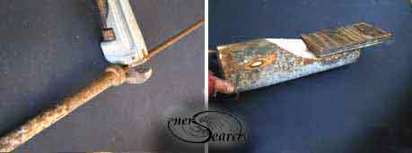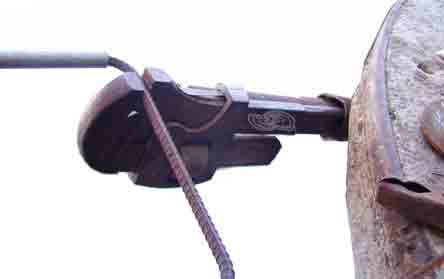 A bender is presented below which is easy for those who like this sort of work. Only people who enjoy the work should try this. One person has complained it was difficult. A person who can't afford better equipment will enjoy the cost savings, since, with determined skill, it is easy to do. Cold bending of steel bars is a valuable skill for sculptural work. First picture demonstrates use of a salvaged plumbing pipe used to hold rod while keeping the rod portion inside of it straight. (The pipe still has part of the original threaded fixture which was kept there retaining more strength at it's work end. A pipe wrench is shown grasping a free end, ready to make an initial, approximate 45 degree bend. (Two junk yard plumbing pipes work well if you don't have wrench).